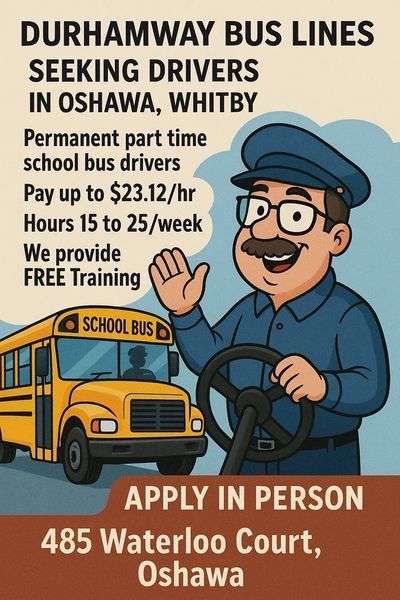 Durhamway Bus Lines: A foundation of service, quality and energetic community-minded people working together to help your children arrive at school safe daily.***Shifts available all year round***Why wait? We will help get you started. Train now! Durhamway is the perfect opportunity for you. AM/PM routes, on-call and spare driver positions are available. Field Trip, Charter and Excursion work is optionally available as well. As a Steady Part-time School Bus Driver, you can earn a steady income supplement without having to work nights, weekends, holidays or school breaks.